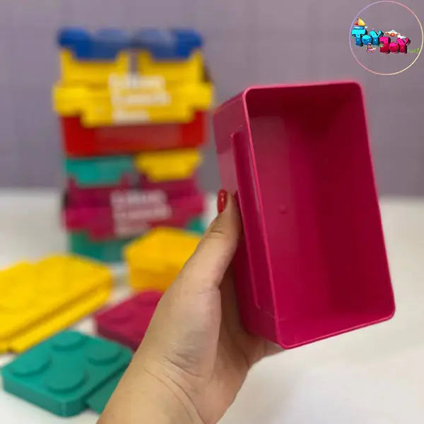 3 ظرف و 3 درب لگویی مجموعا 6 قطعه ( بدنه ظروف همگی قرمز، درب لگویی بزرگ آبی، درب لگویی کوچک آبی و زرد